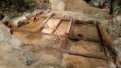 Original wooden-railed tracks of the SCCRR Inclined Plane at Aiken, found in Hitchcock Woods in 2016. This photo is of an archaeological dig performed by the SC Dept. of Natural Resources (SCDNR) in April of 2018.